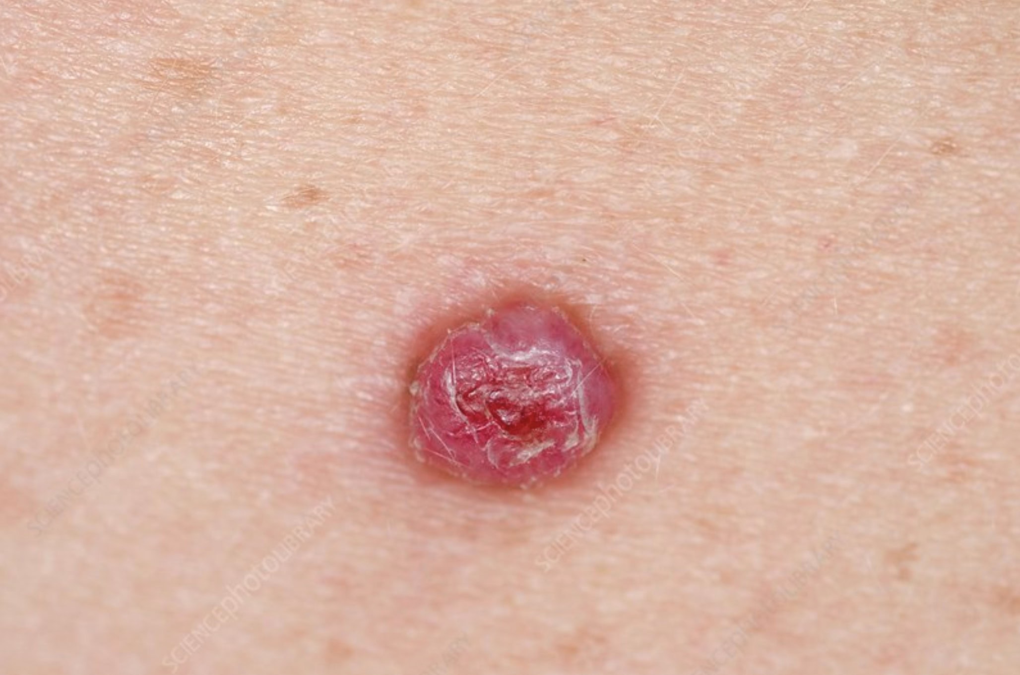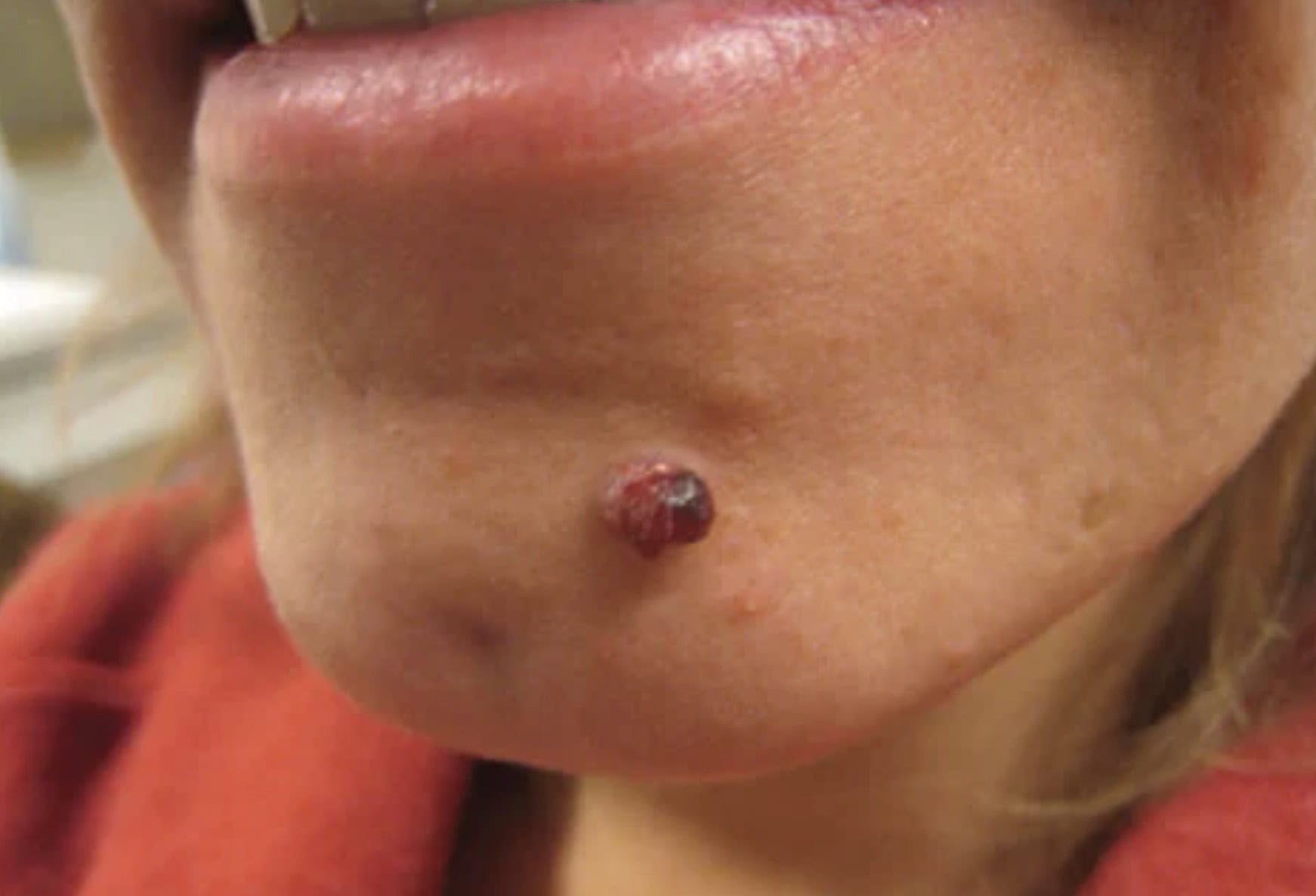 It presents as a shiny red lump with a raspberry-like or minced meat-like surface.